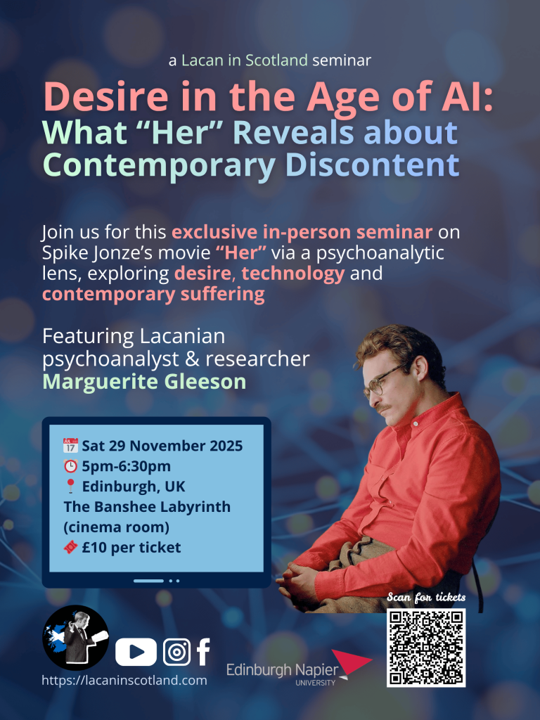 The event is open to all over 18 and no prior knowledge of Lacan is required—though familiarity with the film Her will enrich your experience (spoilers ahead!).